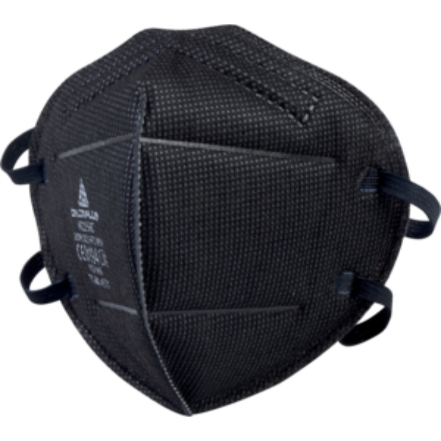 Mascarilla color negro FFP1 de fibra sintética no tejida, con lámina nasal de ajuste y refuerzo borde espuma para un confort respiratorio prolongado.